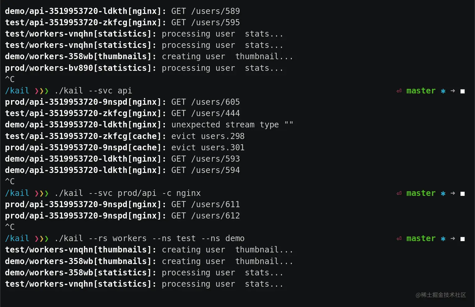 Kail 可以根据不同的匹配条件流式传输 Pod 的日志,例如,Service选择的所有 Pod 或匹配任意标签的所有 Pod。