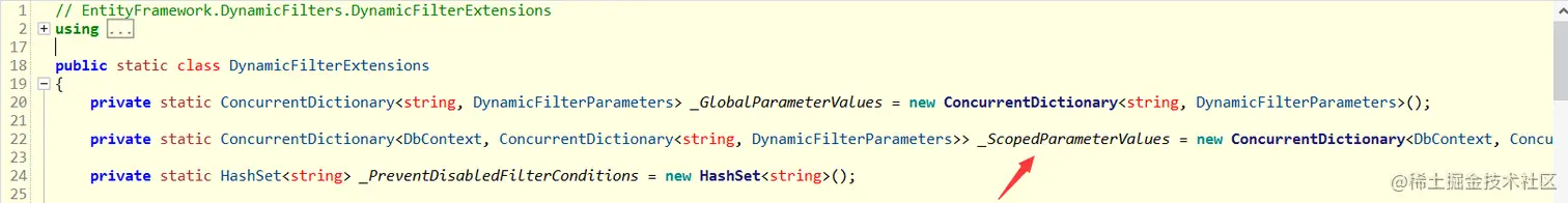 终于给找到了,原来是EF底层的 EntityFramework.DynamicFilters.DynamicFilterExtensions 类哈,导出源码如下: