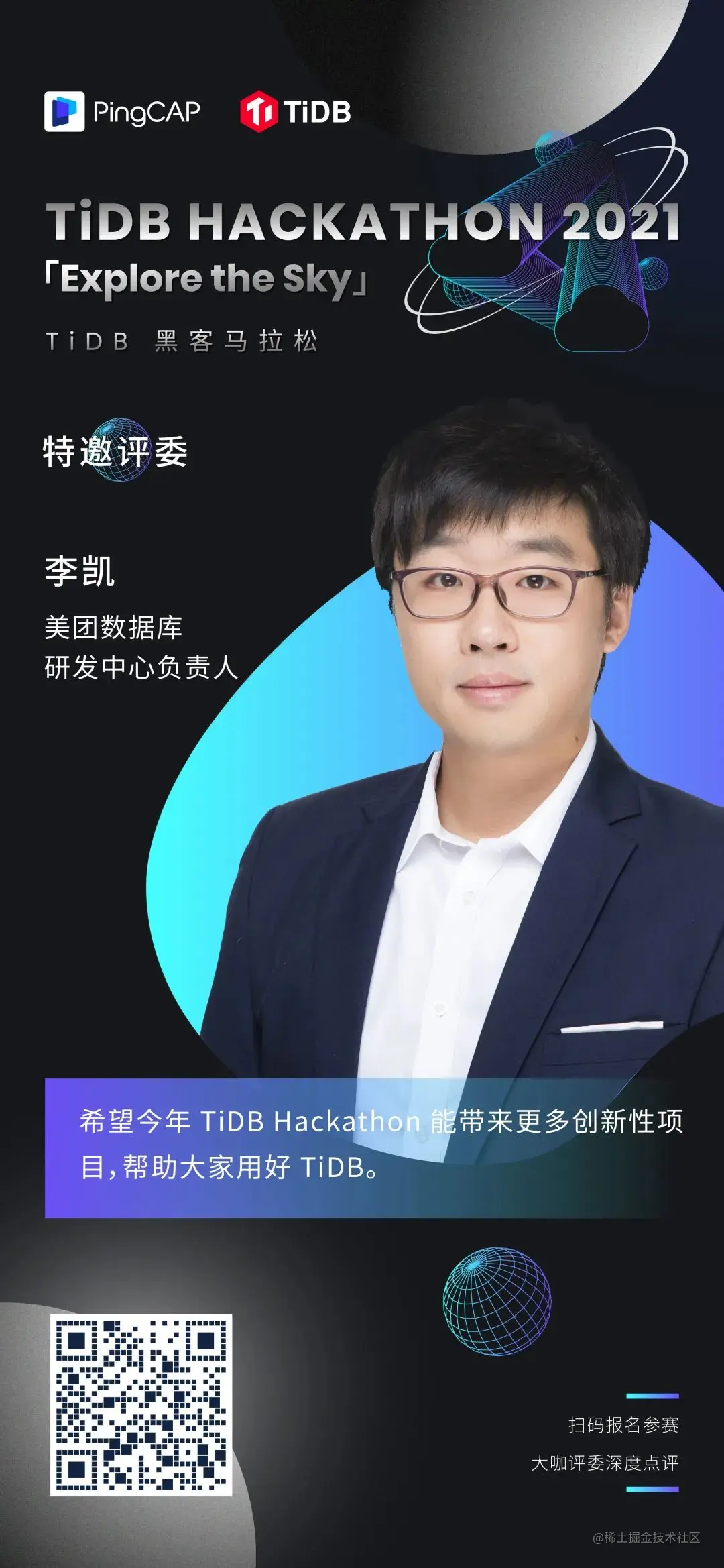 李凯: 今年还是比较期待大家能够带来更多创新性的项目,一方面在技术上能够给比如美团在用的 TiDB 5.0 上进一步挖掘更多潜力,另一方面通过大家在各个行业或高校里的经验,能把一些创新的 idea 贡献到这里,让大家能够更好地使用 TiDB 数据库。