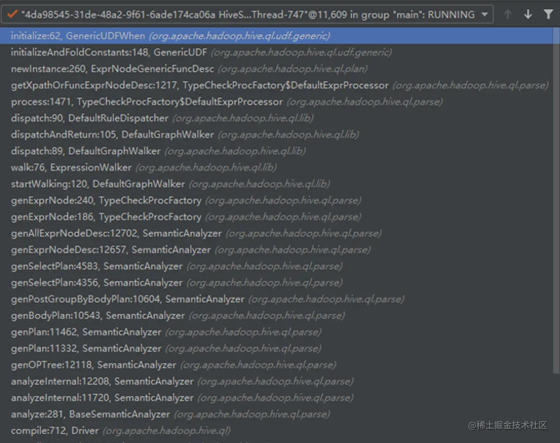 TypeCheckProcFactory.getXpathOrFuncExprNodeDesc中根据sql中运算符或UDF名称生成表达式对象ExprNodeGenericFuncDesc,内部调用GenericUDF方法。