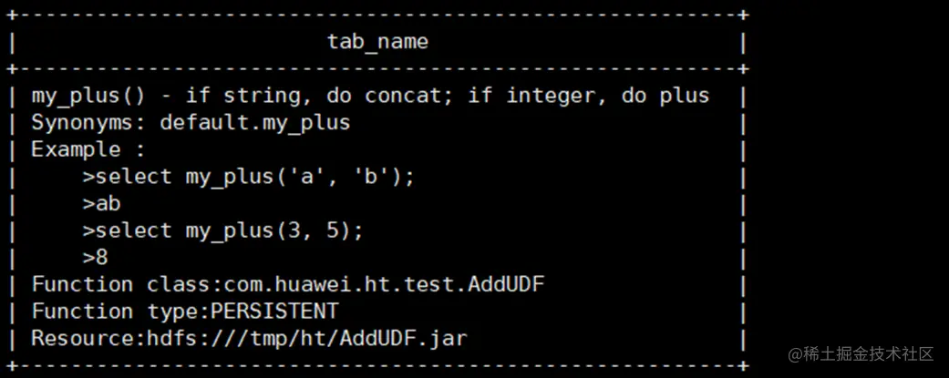 create function my_plus as 'com.huawei.ht.test.AddUDF' using jar 'hdfs:///tmp/ht/AddUDF.jar';