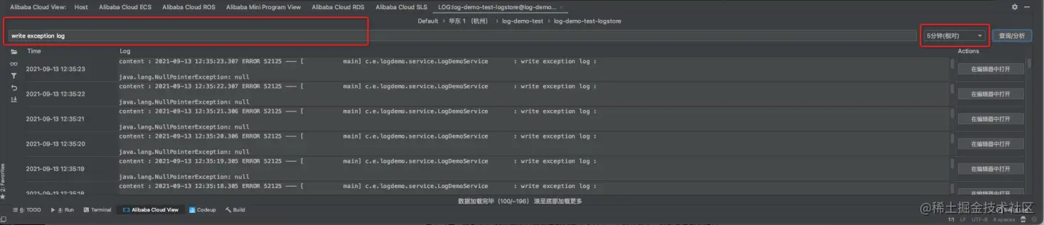 我们在SLS的页面上确认日志已经成功采集到了之后,服务的模拟和日志平台的接入就已经完成了,下面我们回到ide里。