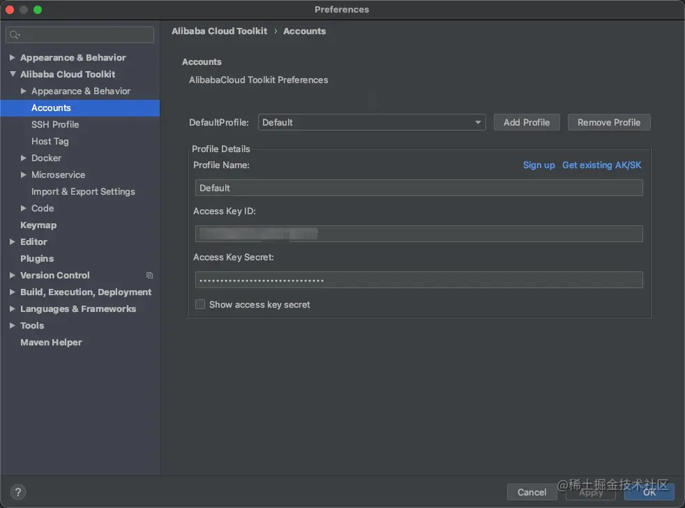 点击Tools-> Alibaba Cloud -> Preference,配置账号信息,这里需要把拥有SLS日志查看权限的账号的Access Key Id和Access Key Secret填入