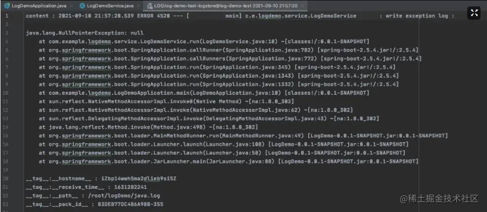 首先我们模拟一个线上发生异常的服务。创建一个简单的springboot服务,然后实现ApplicationRunner的一个Component类型的bean,做的事情非常简单,就是每秒打印一行NPE的日志,用来模拟线上发生NPE的服务。