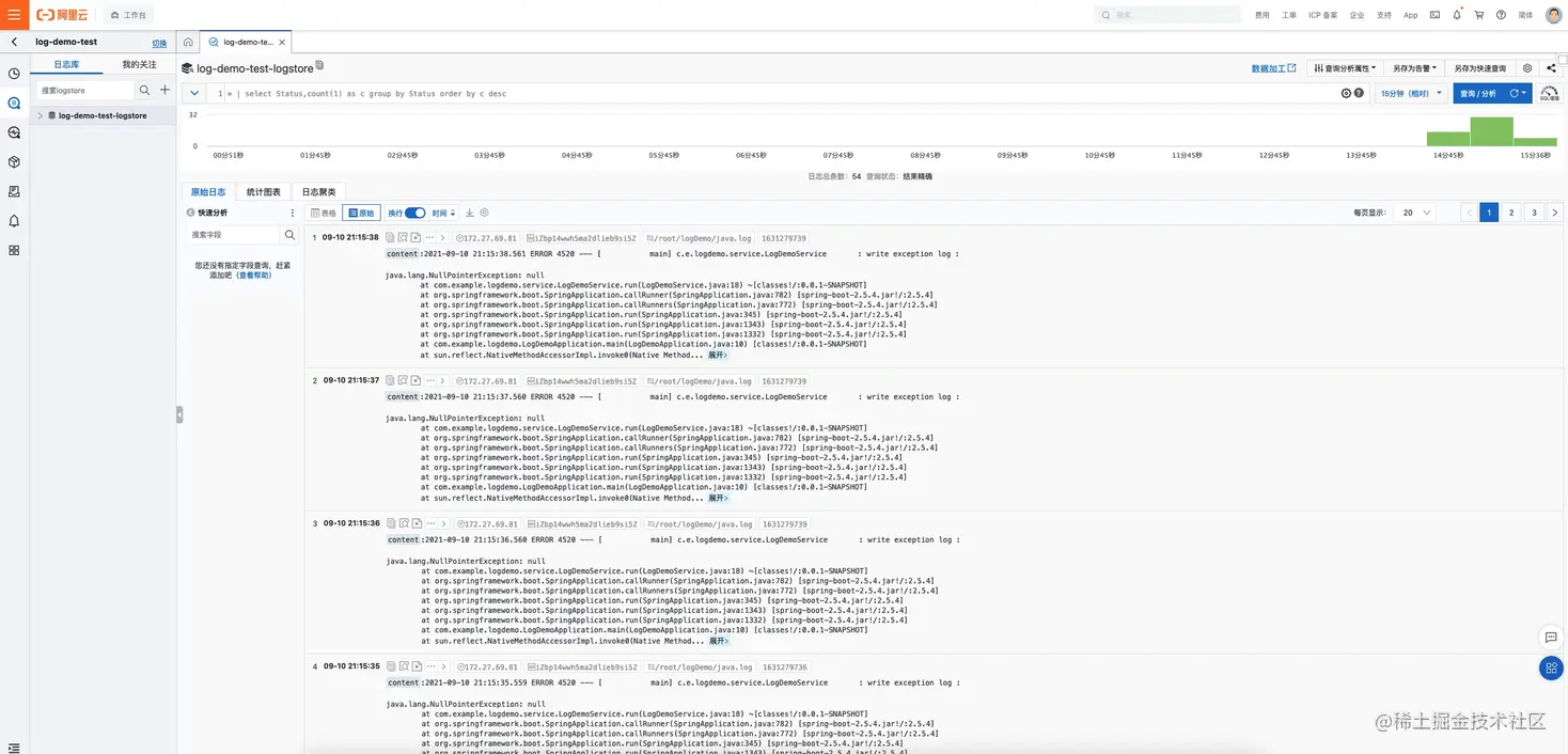 就可以像SLS的页面一样,在ide里面查看服务的日志了,这个界面还支持日志时间范围的筛选和查询、分析语句的筛选,可以帮助开发人员快速准确的找到想要的日志数据。SLS查询和分析语句可以参考文档:help.aliyun.com/document\_d…