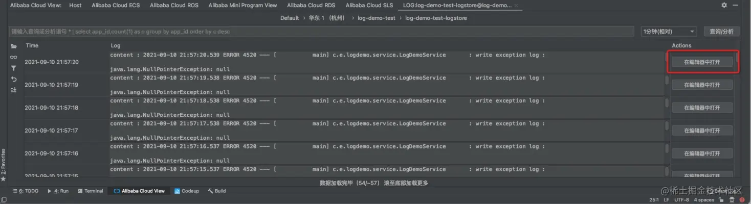 像Java Stack Trace这种比较长的日志,在这个界面没有办法一次性看到完整的信息,在查询结果每条日志右侧有一个"在编辑器中打开"的按钮