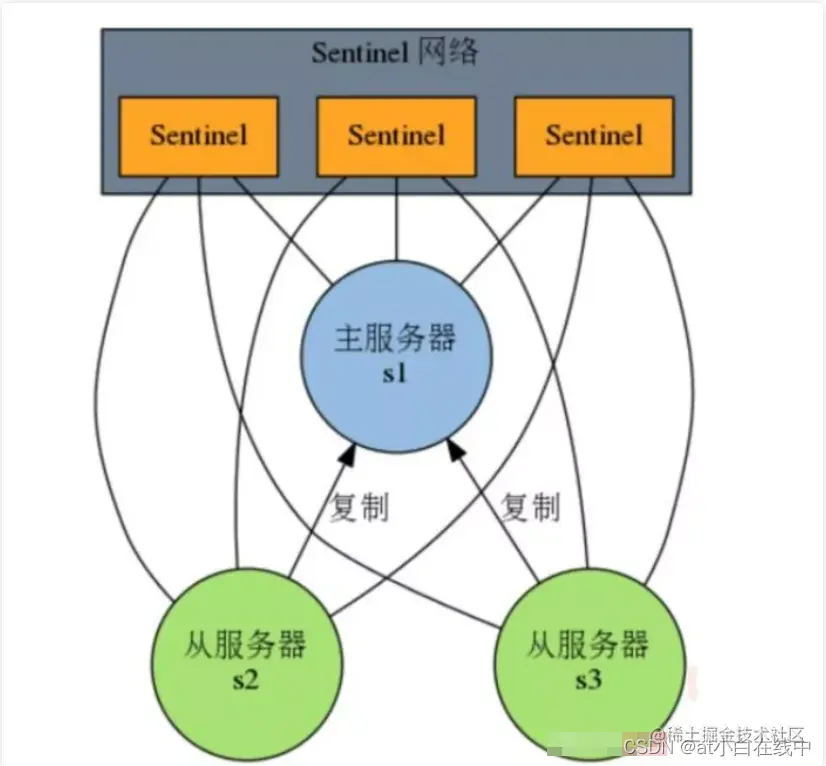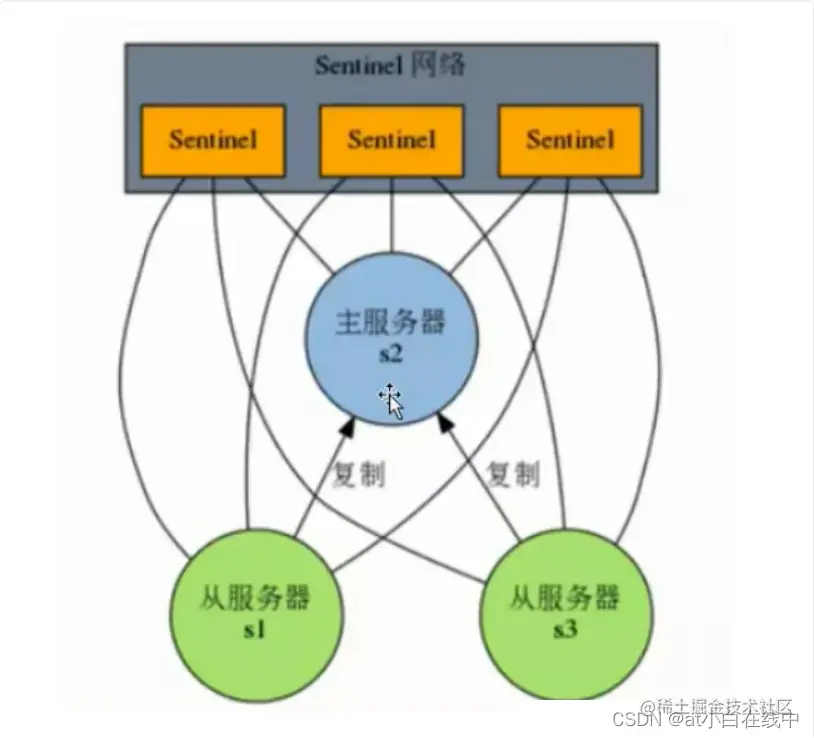 sentinel是官方提供的高可用方案,其原理是哨兵通过发送命令,等待Redis服务器响应,从而监控运行的多个Redis实例。同时 sentinel是一个分布式系统,可以在一个架构中运行多个Sentinel进程,可以做到sentinel的高可用。