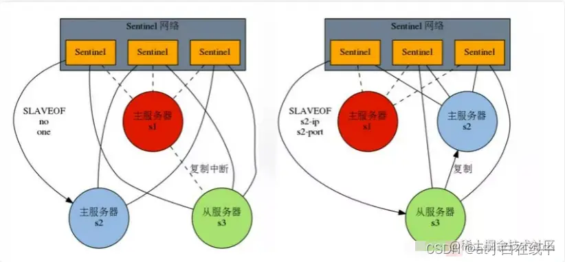 当主服务器发生故障时,此时一个sentinel发现了故障,系统并不会马上进行failover过程(这个现象称为主观下线),它会向网络中的其他Sentinel进行确认。
