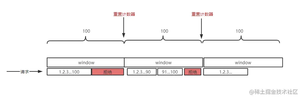 从某个时间点开始每次请求过来请求数+1,同时判断当前时间窗口内请求数是否超过限制,超过限制则拒绝该请求,然后下个时间窗口开始时计数器清零等待请求。