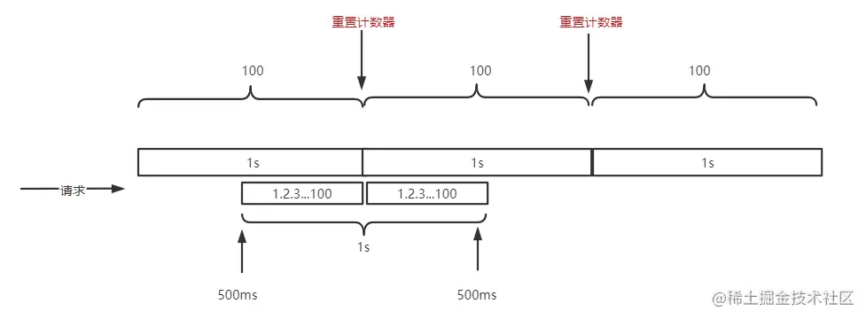 假设每 1s 限流 100 次请求,用户在中间 500ms 时开始 1s 内发起 200 次请求,此时 200 次请求是可以全部通过的。这就和我们预期 1s 限流 100 次不合了,根源在于限流的细粒度太粗。