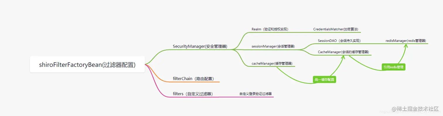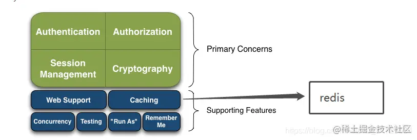 shiro主要由这些组件构成,这些组件能够支撑一个最小权限系统。在外部我们引用redis来做shiro的缓存载体。