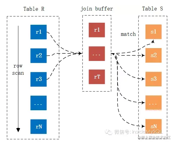 可以看到Join Buffer用以缓存链接需要的列,然后以Join Buffer批量的形式和内表中的数据进行链接比较。就上图来看,记录r1,r2 … rT的链接仅需扫内表一次,如果join buffer可以缓存所有的外表列,那么链接仅需扫描内外表各一次,从而大幅提升Join的性能。