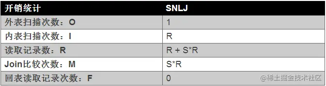 SNLJ的算法相当简单、直接。即外表(驱动表)中的每一条记录与内表中的记录进行判断。但是这个算法也是相当粗暴的,粗暴的原因在于这个算法的开销其实非常大。假设外表的记录数为R,内表的记录数位S,根据上一节Inside君对于Join算法的评判标准来看,SNLJ的开销如下表所示: