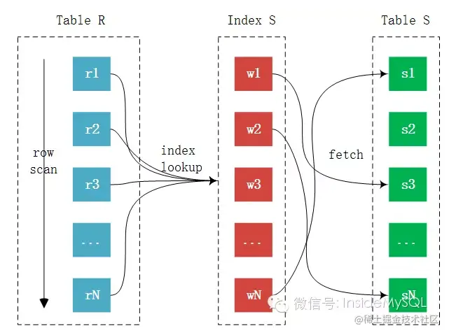 大部分人诟病MySQL的INLJ慢,主要是因为在进行Join的时候可能用到的索引并不是主键的聚集索引,而是辅助索引,这时INLJ的过程又需要多一步Fetch的过程,而且这个过程开销会相当的大: