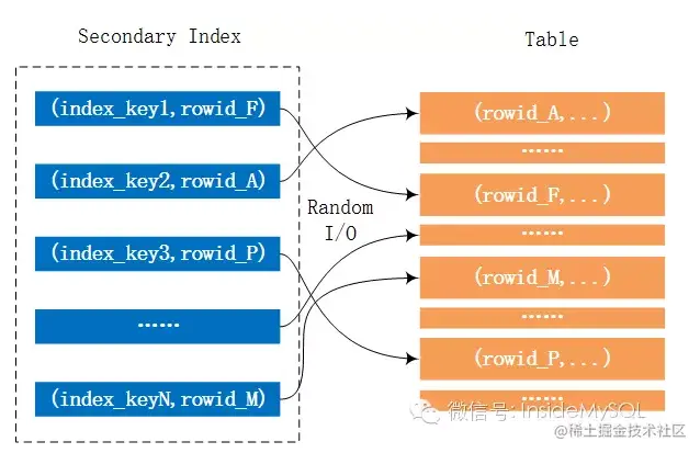 上述的SQL语句需要根据辅助索引i_o_orderdate进行查询,但是由于要求得到的是表中所有的列,因此需要回表进行读取。而这里就可能伴随着大量的随机I/O。这个过程如下图所示: