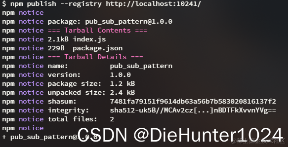完成后输入npm publish --registry http://localhost:10241/将代码发布到npm仓库