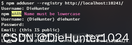注册用户:使用npm adduser --registry http://localhost:10241/注册用户,输入用户名(小写),密码,邮箱