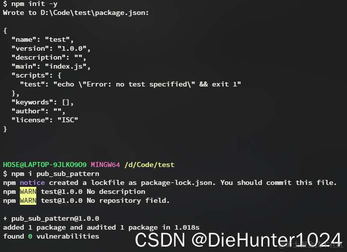 以之前写的PubSubPattern(发布订阅)为例子,在文件夹中 npm init -y 新建package.json文件,并配置name,version等