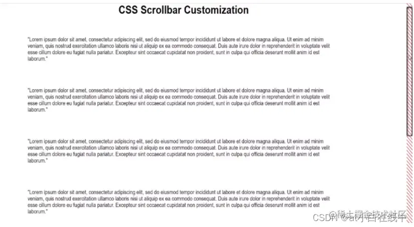 需要注意的重点是,你可以使用 hover 和 active 伪元素来进一步设置滚动条样式。本例中,当你把鼠标悬停在滑块上以及拖动滑块时它的颜色会变成更深的灰色。