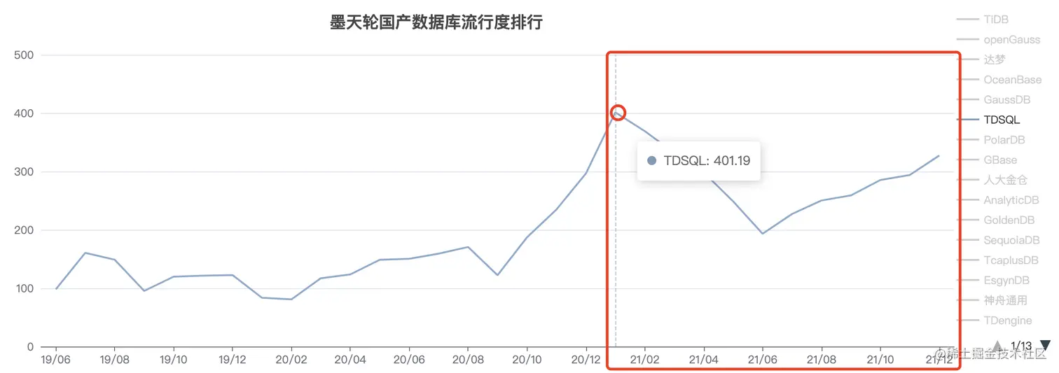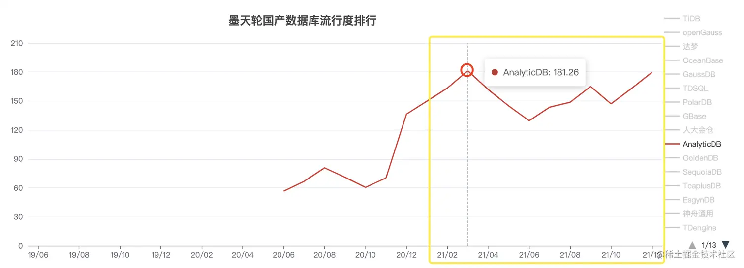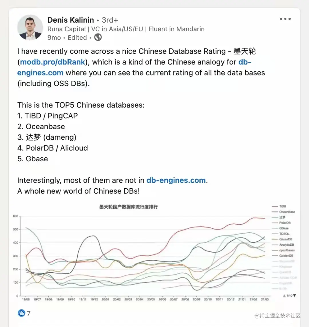 墨天轮国产数据库流行度排行于 2019 年 6 月推出,2021 年全年增加了 84 款数据库产品,截至 2021 年 12 月共收录 189 款产品。 随国内数据库行业快速发展,墨天轮排行考量标准也在相应的优化调整,2021 年 11 月主要调整指标包括三方评测、生态、专利数和论文数,具体见《墨天轮国产数据库流行度排行》得分计算规则说明,向客观、中立、公正看齐。 Denis Kalinin(国际风投基金 Runa Capital 亚洲业务拓展经理)发布了如下内容,恭喜墨天轮出圈,排行榜影响力进一步扩大。