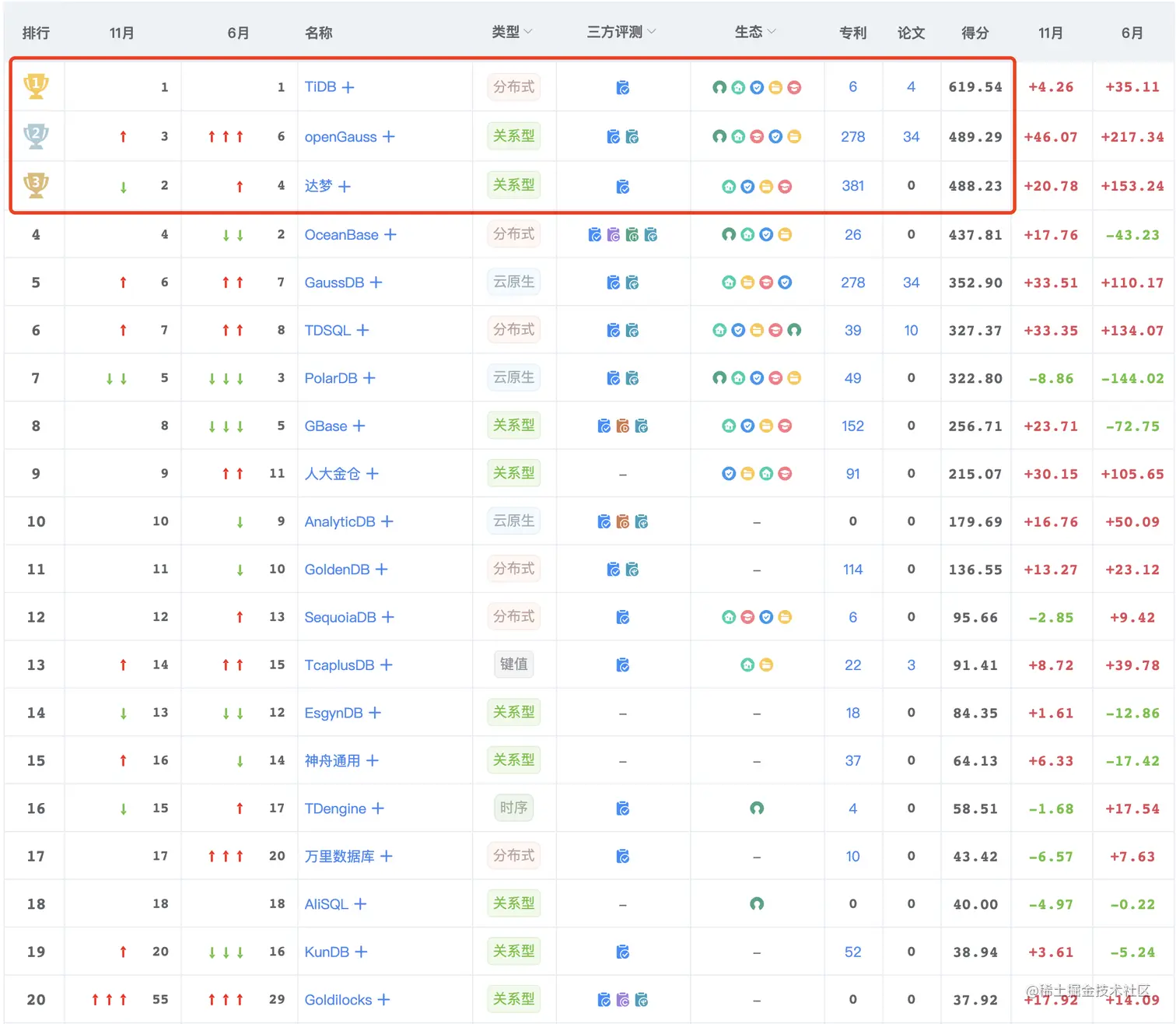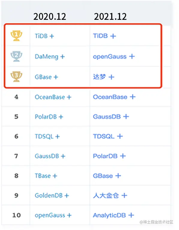 本月除了产品排行的更新,产品得分计算规则也进行了一次大的优化调整,目的是为保证评分方式客观和专业,具体见《墨天轮国产数据库流行度排行》得分计算规则说明。 部分排行信息截图如下,年终月 TOP3 分别是 TiDB、openGauss 和达梦。 相比 11 月,TOP10 中的排行出现 “三升两降” 的情况,openGauss 首次夺得第二的位置,以 1.06 分的优势领先于第三位的达梦,排名一路飙升; TOP20 中大部分产品得分有所增加,其中只有 5 款产品出现得分小范围减少;同时还值得关注的是本月排名 20 的 Goldilocks 上升明显。