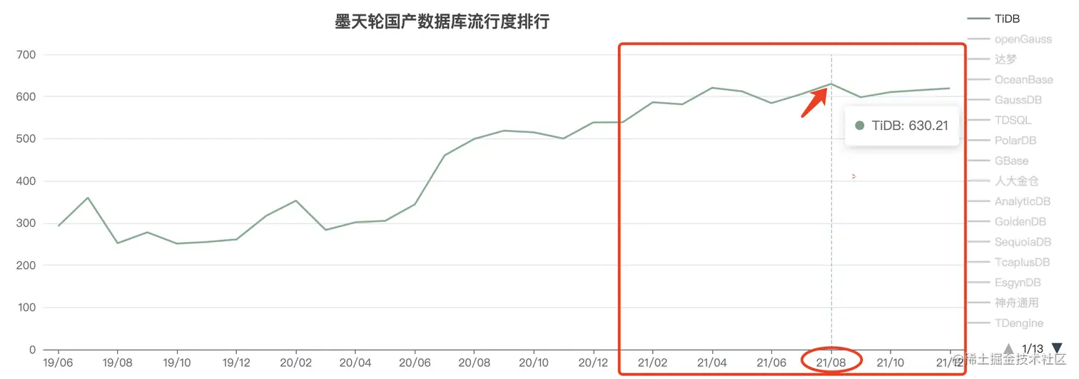 12 月分数:619.54(全年 +80.83) 本月 TiDB 以过百分差的压倒性优势领先于季亚军,并连续 24 个月保持着冠军的成绩,历史最高分 630.21 在今年的 8 月。