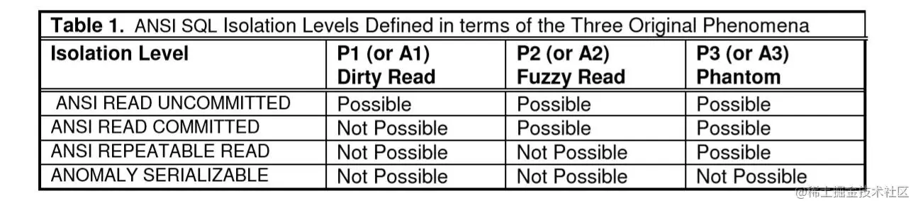 在论文 A Critique of ANSI SQL Isolation Levels 中作者指出 ANSI 给出的现象是不明确的,即使在最宽松的解释中也不排除执行历史中可能出现的一些异常行为,会导致一些反直觉的结果。并且,基于锁的隔离级别与等效 ANSI phenomena 有不同的特性,而商业数据库系统通常使用锁实现隔离级别。此外,ANSI 的现象不能区分出商业系统中许多类流行的隔离级别的行为。