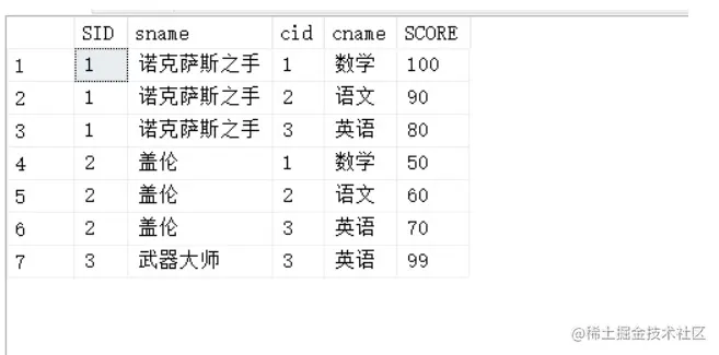这时候我们更改一下数据,课程表中新增物理、化学两门课程,诺克萨斯之手分别选择了两门课程,盖伦仅仅选择了化学,武器大师逃学,俩门课都没有选择。