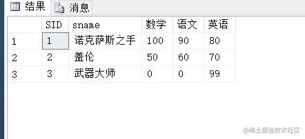 INSERT INTO Course SELECT 4,'物理' INSERT INTO Course SELECT 5,'化学' INSERT INTO SC SELECT 1,4,99 INSERT INTO SC SELECT 1,5,88 INSERT INTO SC SELECT 2,5,77 EXEC dbo.StudentScore_Proc