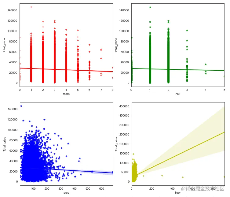 通过绘制广州二手房回归图,我们发现,广州二手房居室数、面积与房价相关性并不大。房屋楼层与房价看似具有较强的正相关,其实是受三个异常值影响,并不具有相关性。