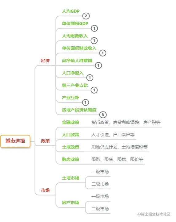 那么,我们该如何分析房地产市场?我从数据分析的角度,归纳梳理了一下思路,我认为一个城市的房地产市场分析应该包括城市经济、相关政策、土地市场和房产市场四个方面。城市经济反映了一个城市的经济实力和潜能,可以细分出以下几个指标:人均GDP和单位面积GDP、人均财政收入和单位面积财政收入、高净值人群规模、人口净流入、第三产业占比、产业互补、房地产投资依赖度、城市友好度等。政府制定的政策对房地产市场影响也是巨大的,相关性较高的政策有金融政策、人口政策、土地政策和购房政策等。最后就是城市土地市场和房产市场分析,这也是整个分析最核心的部分。