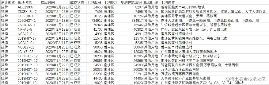 运行爬虫代码,提取到广州1238块土地数据。以下为简单清洗后部分数据: