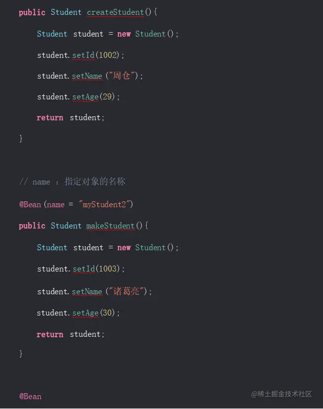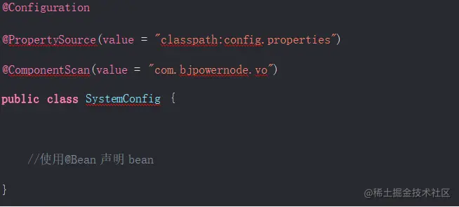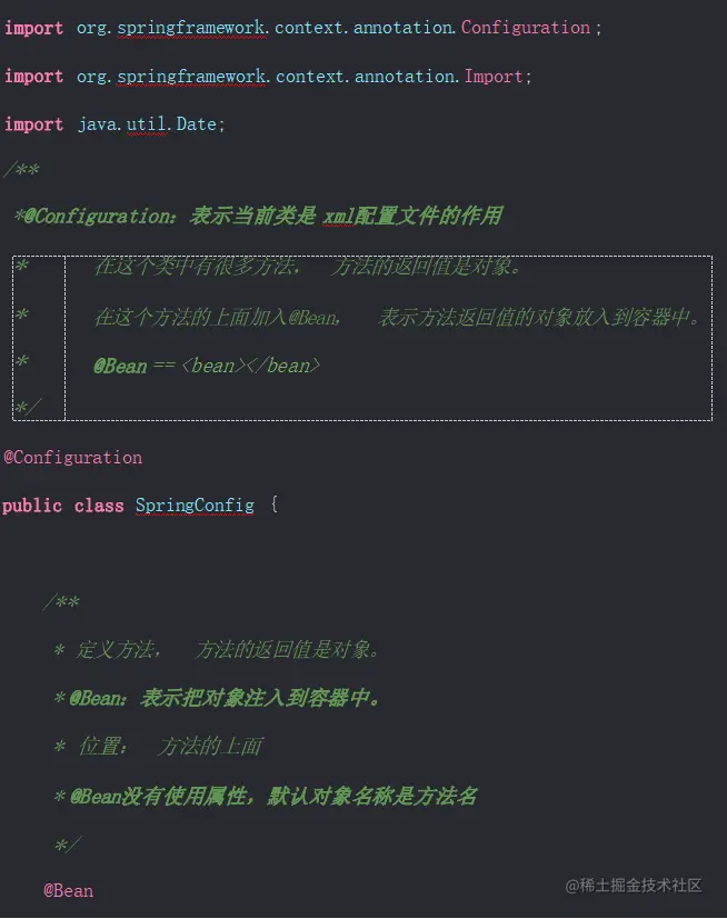 @Configuration:放在类的上面, 这个类相当于xml配置文件,可以在其中声明bean @Bean:放在方法的上面, 方法的返回值是对象类型, 这个对象注入到 spring ioc 容器