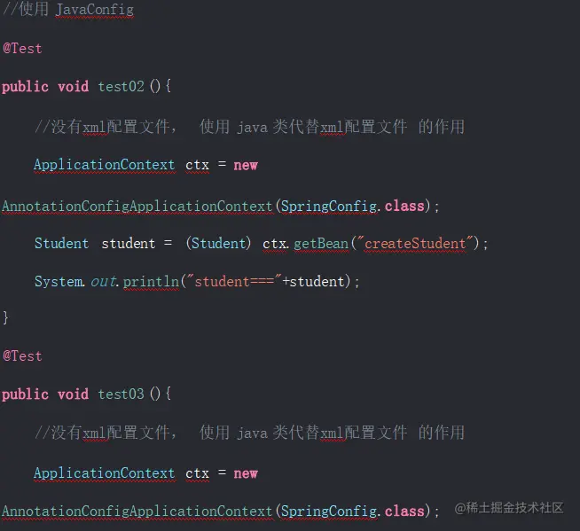 JavaConfig: 是 Spring 提供的使用 java 类配置容器。 配置 Spring IOC 容器的纯 Java 方法。