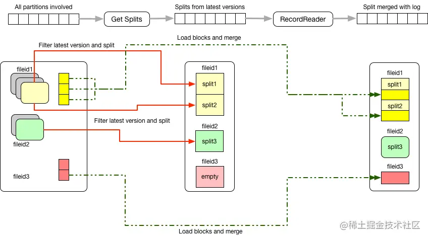commit meta timeline使能够在hdfs上的相同数据同时做读优化视图和实时视图;这些视图允许客户端在数据延迟时间和查询执行时间之间进行选择。Hudi为这些视图提供了一个自定义的InputFormat,并包括一个Hive注册模块,该模块将这两个视图注册为Hive metastore表。这两种输入格式都理解fileId和提交时间,并过滤文件,只选择最近提交的文件。然后,Hudi对这些数据文件进行分割,以运行查询计划。InputFormat的详细内容如下: