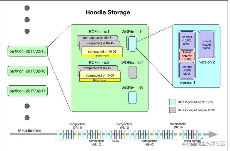图5:Hudi存储内部。上面的Hudi Storage图描述了一个YYYYMMDDHHMISS格式的提交时间,可以简化为HH:SS。