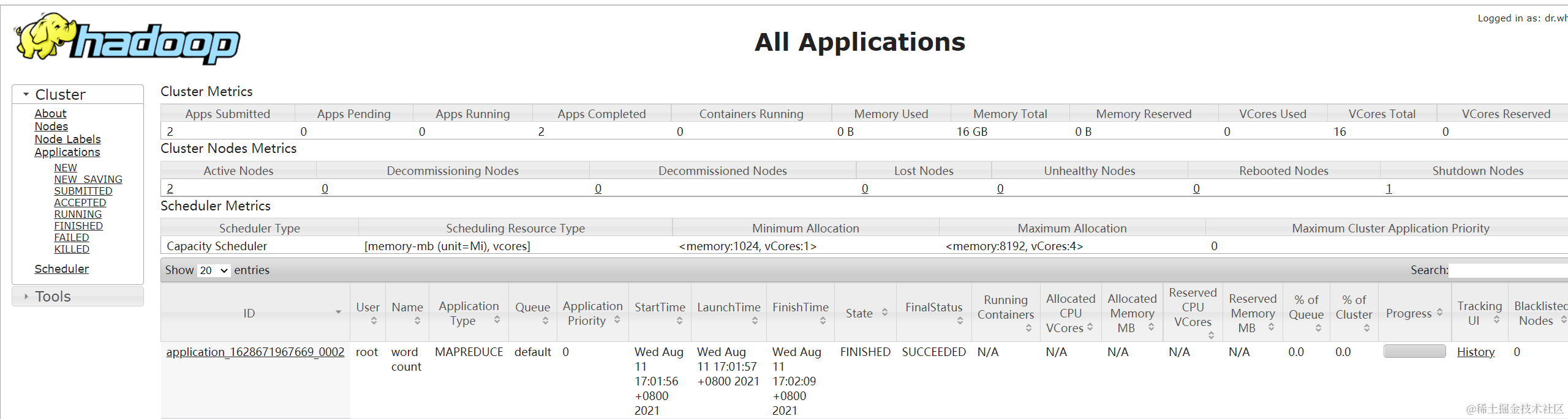 打开页面:http://hadoop2:8088,即可看到: