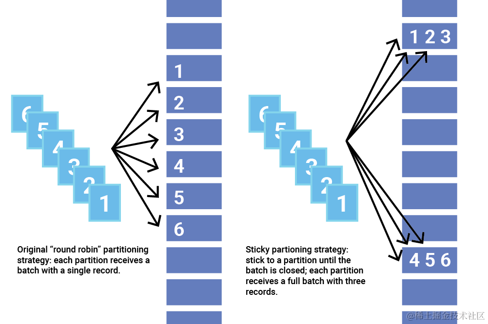 粘性分区器通过选择单个分区来发送所有非键记录,解决了将没有键的记录分散成较小批次的问题。 一旦该分区的批次被填满或以其他方式完成,粘性分区程序会随机选择并“粘”到一个新分区。 这样,在更长的时间内,记录大致均匀地分布在所有分区中,同时获得更大批量的额外好处。