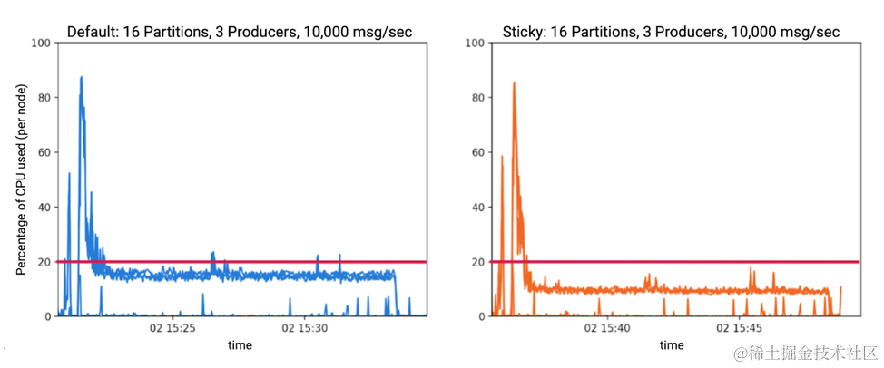 在执行这些基准测试时,需要注意的一件事是粘性分区程序在许多情况下会降低 CPU 使用率。
