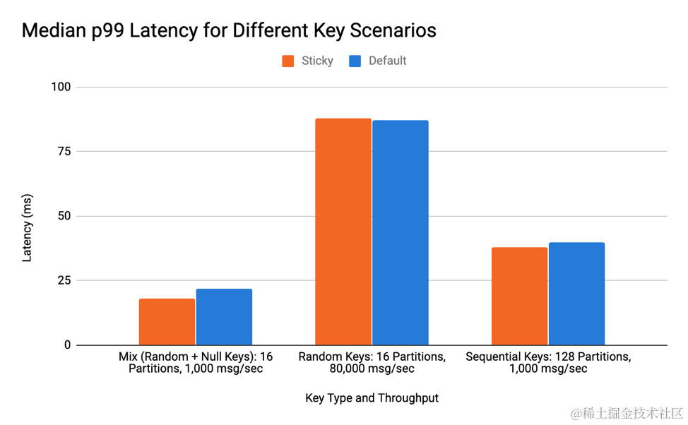 粘性分区器有助于提高客户端在生成无密钥消息时的性能。但是当生产者生成无密钥和有密钥消息的混合时,它是如何执行的呢?使用随机生成的密钥以及混合密钥和无密钥的测试表明延迟没有显着差异。