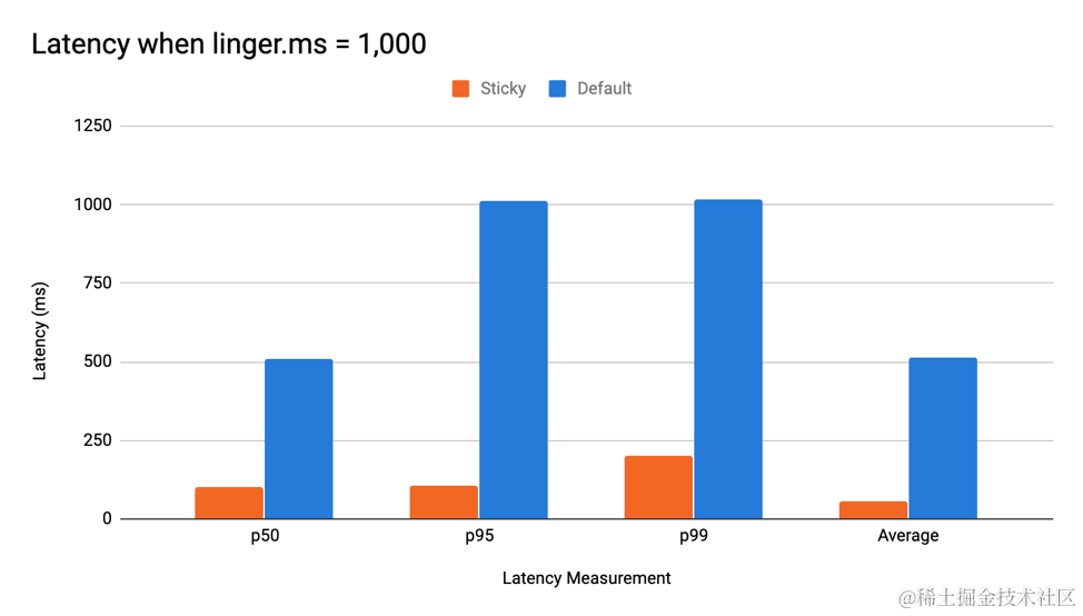 如前所述,等待 linger.ms 可能会给系统注入延迟。 粘性分区程序旨在通过将所有记录发送到一个批次并可能更早地填充它来防止这种情况。 在吞吐量相对较低的情况下使用 linger.ms > 0 的粘性分区程序可能意味着延迟的惊人减少。 当使用一个每秒发送 1,000 条消息且 linger.ms 为 1,000 的生产者运行时,默认分区策略的 p99 延迟是五倍。 下图显示了 ProduceBench 测试的结果。
