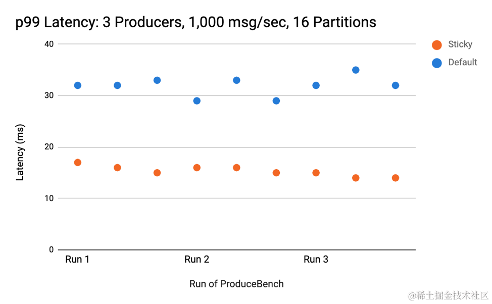在几乎所有将原始 DefaultPartitioner 与新改进的粘性版本进行比较的测试中,后者(粘性)的延迟与原始 DefaultPartitioner(默认)相同或更少。 当将具有 3 个每秒产生 1,000 条消息的集群的第 99 个百分位 (p99) 延迟与具有 16 个分区的主题进行比较时,粘性分区策略的延迟约为默认策略的一半。 以下是三个运行的结果: