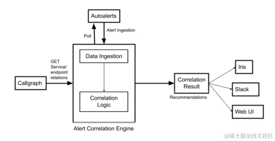 Alert Correlation 服务会定期轮询我们的警报数据库,称为“Autoalerts”(Autoalerts 是 LinkedIn 用于用户定义警报的警报系统),以检查我们基础设施中的活动警报。连同调用图和警报数据,我们构建了一个不健康服务及其依赖关系的图表,包括为图表中的单个服务触发的活动警报(指标超过设定阈值)。将度量数据点与上游和下游依赖项进行比较,以得出置信度分数和严重性分数。置信度分数表示特定服务成为根本原因的概率。严重性评分表示确定的根本原因对上游服务造成的不利影响的程度。这些分数是通过算法得出的,尽管该实现的细节超出了本文的范围。 Alert Correlation 中的一个模块对受共同根本原因影响的上游进行分组,并生成相关结果,也称为推荐,这些结果通过 Slack、Web UI 和 Iris(Linkedin 的内部通知系统)等不同界面与用户共享。