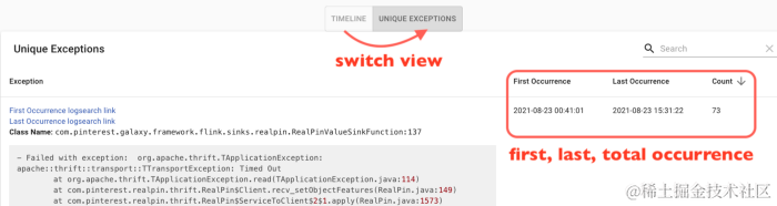 只需单击一下,我们就可以切换到“唯一异常”视图,其中相同的异常与元数据(例如第一次、最后一次和总出现次数)一起分组在一行中。 这简化了识别最常见异常的过程。