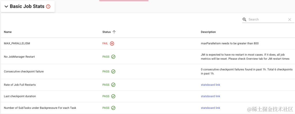 - 基本作业统计部分监控基本统计信息,例如吞吐量、完全重启率、检查点大小/持续时间、连续检查点失败、过去 1 小时内的最大并行度。 当指标未通过健康检查时,它们会被标记为失败并排在最前面。