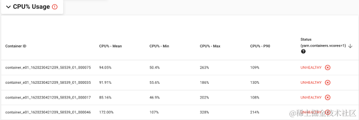 CPU% Usage 部分显示使用的 CPU 容量比分配给它们的 vcore 多的容器。 这有助于监控和避免多租户 Hadoop 集群中的“嘈杂邻居”问题。 非常高的 CPU% 使用率可能会导致一个用户的工作负载影响另一用户工作负载的性能和稳定性。