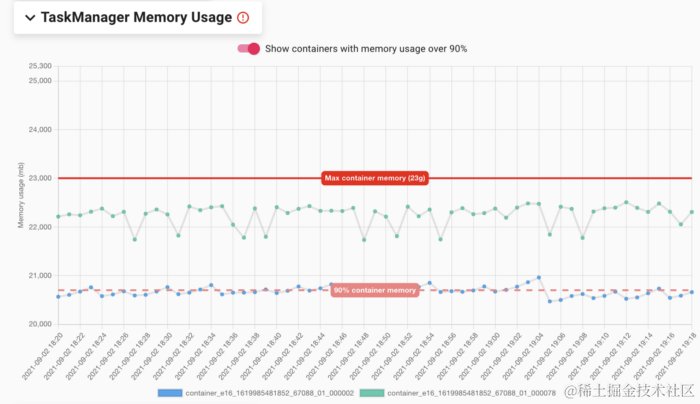 JobManager/TaskManager Memory Usage 跟踪 YARN 容器内存使用情况,这是我们通过在工作节点上运行的守护进程收集的 Flink Java 进程的常驻集大小(RSS)内存。 RSS 内存更准确,因为它包括 Flink 内存模型中的所有部分以及 Flink 未跟踪的内存,例如 JVM 进程堆栈、线程元数据或通过 JNI 从用户代码分配的内存。 我们在图中标记了配置的最大 JM/TM 内存,以及 90% 的使用阈值,以帮助用户快速发现哪些容器接近 OOM。