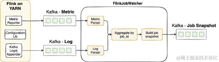 从上面的功能可以看出,指标和日志都集中在一个地方。 为了以可扩展的方式收集它们,我们在 Flink 自定义构建中添加了 MetricReporter 和 KafkaLog4jAppender,以持续向 kafka 主题发送指标和日志。 KafkaLog4jAppender 还用于过滤掉对我们很重要的日志——警告、错误和带有堆栈跟踪的信息日志。 紧随其后的是 FlinkJobWatcher——一个 Flink 作业,它在一系列解析和转换后连接来自同一作业的指标和日志。 然后 FlinkJobWatcher 每 5 分钟创建一次作业健康状况快照,并将其发送到 JobSnapshot Kafka 主题。