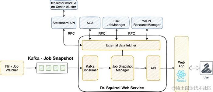 一旦 JobSnapshot 可用,需要获取更多数据并合并到 JobSnapshot 中。 为此,我们使用 dropwizard 构建了一个 RESTful 服务,该服务不断读取 JobSnapshot 主题并通过 RPC 提取外部数据。 外部数据源包括 YARN ResourceManager 用于获取静态数据(如用户名和启动时间)、Flink REST API 用于获取配置、称为Automated Canary Analysis(ACA)的内部工具,用于将时间序列指标与具有细粒度标准的阈值进行比较,以及 一些其他内部工具允许我们显示自定义指标,例如 RSS 内存和 CPU% 使用率,这些指标是从工作节点上运行的守护程序收集的。 React 还构建了一个漂亮的 UI,使工作健康易于探索。