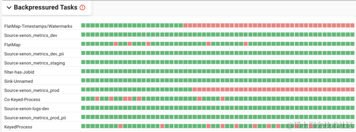背压任务以细粒度跟踪每个算子的背压情况。 一分钟内没有背压显示为绿色方块,否则为红色方块。 每个算子60个方格,代表过去1小时的背压情况。 这样可以轻松确定背压发生的频率以及哪个operator最早启动。